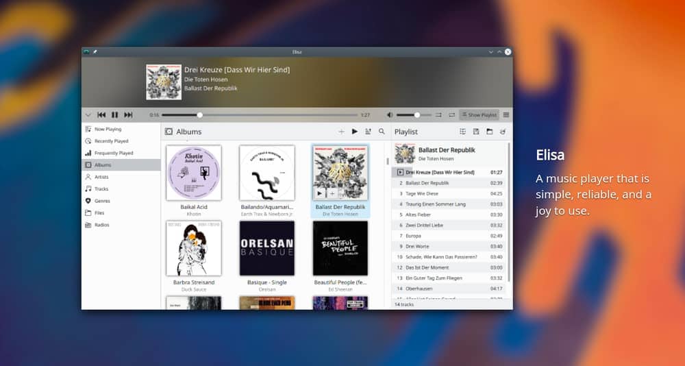 Check out Elisa, another great music player for KDE systems as well as other platforms. This is visually beautiful with a materialistic UI design. It works smoothly on Linux systems, even on Windows, and does not require any additional configuration. The outlook of Elisa also looks like a Windows media player, which is helpful for new Linux users. You install it and are ready to play.