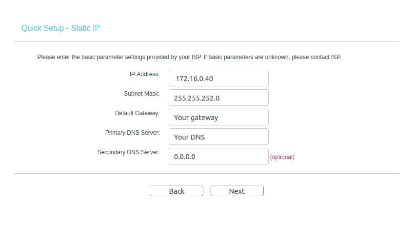 Now you have to fill up the blank boxes with your static IP address, subnet mask, default gateway, primary DNS server, and secondary DNS server address. Then click on the Next button and finish the router configuring process by setting up your wireless network SSID and password.