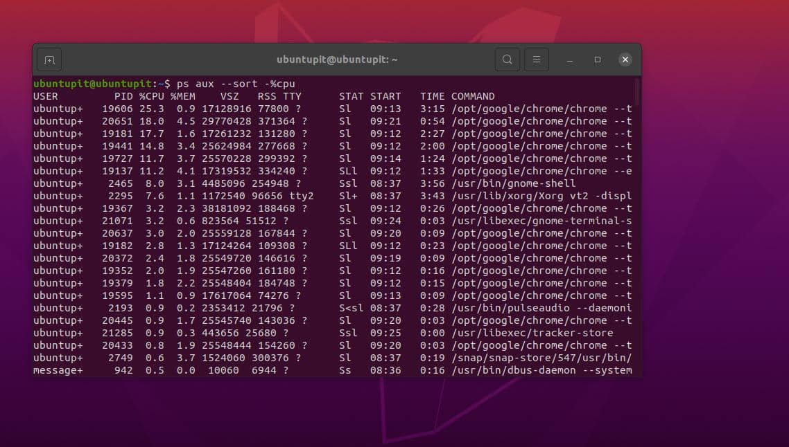 In a similar way, you can also get the statistics and the usage summary of the CPU on your Linux system through the following ps command given below. As you can see that the -sort syntax is used in both CPU and memory commands, it actually filters out the data for CPU and memory usage on the machine.
