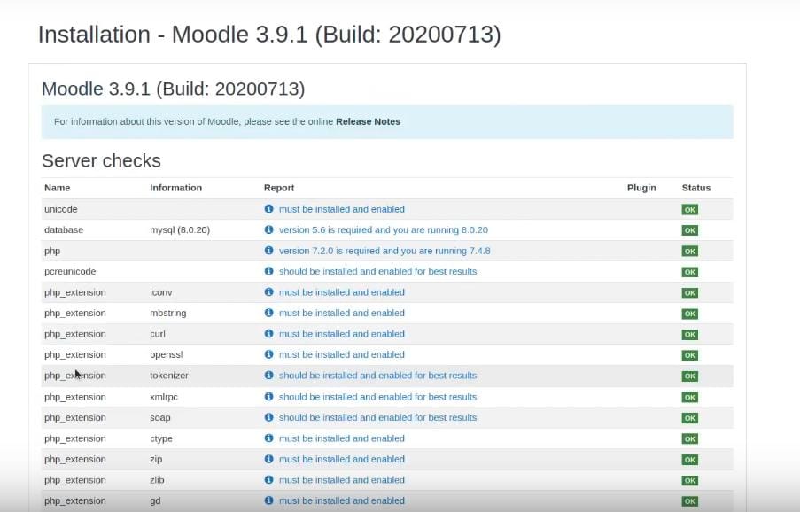 If you have done everything correctly, you will be able to see the OK status in every report. Then restart the Apache server, reload the setup page and continue.
